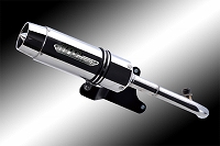 箱を空けて、マフラーを取り出していた編集部パクが「えぇ!なにコレ!?」と、驚きの声を挙げた。何事かと駆け寄ってビックリ!パクの手にあったのは、まるでジェット機のエンジンのような、見たこともないデザインのサイレンサーだった。