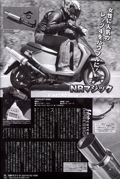 斬新なアイデアで常に新しいトレンドを発信するミニバイク界の老舗NRマジックの新作「Vアストロ・ファイナル」が今春デビューした。「静かで速い」系マフラーをいち早く取り入れた同社独自の「OASISサイレントシステム」「VES構造」を採用していて全域でのパワーアップと静寂製を融合させたハイブリットマフラーに仕上がっている。