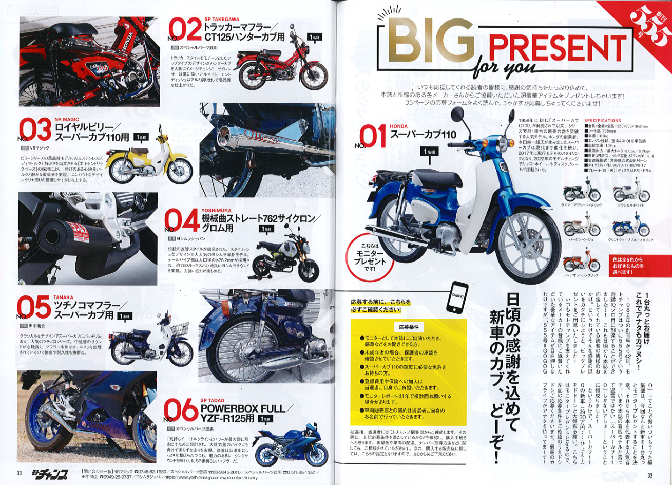 創刊555号の「BIG PRESENT」企画に、弊社のロイヤルビリー/スーパーカブ110用を提供いたしました。
